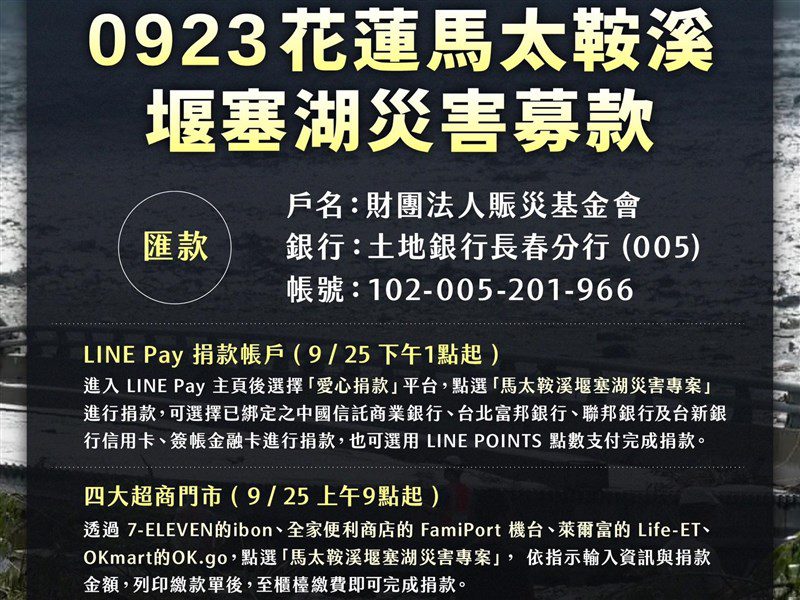 衛福部財團法人賑災基金會「0923花蓮馬太鞍溪堰塞湖災害募款專案」,戶名:財團法人賑災基金會、銀行名稱:土地銀行長春分行(005)、銀行帳號:102-005-201-966。勸募期間為9月25日至10月24日止。(編輯:林克倫、林家嫻)1140924