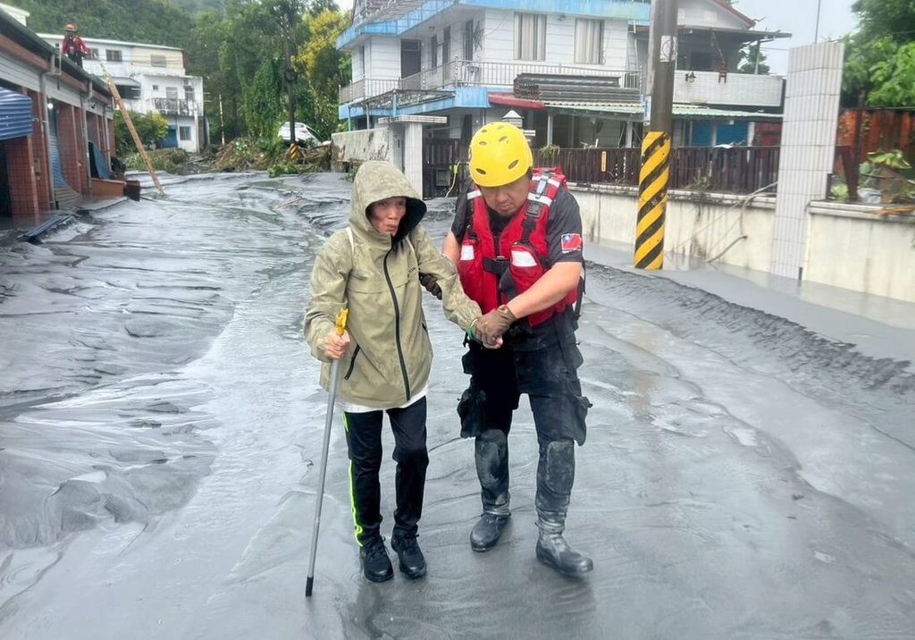 花蓮縣光復鄉多處嚴重災情,新北市消防局25日表示,第一時間啟動跨縣市救援,特種搜救大隊分梯次進駐災區,協助安全撤離災民。圖為警義消協助婦人撤離災區。(新北市消防局提供)中央社記者黃旭昇新北傳真 114年9月25日