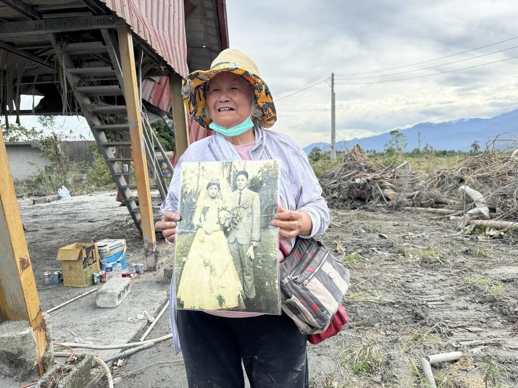 (中央社記者張祈花蓮縣26日電)花蓮光復鄉東富村阿陶莫部落位在馬太鞍溪下游,洪水沖進部落,水淹超過1層樓,還好族人都已撤離無傷亡。76歲李秀玉今天返家清理時,找到結婚紀念照開心說「還好老公還在」。