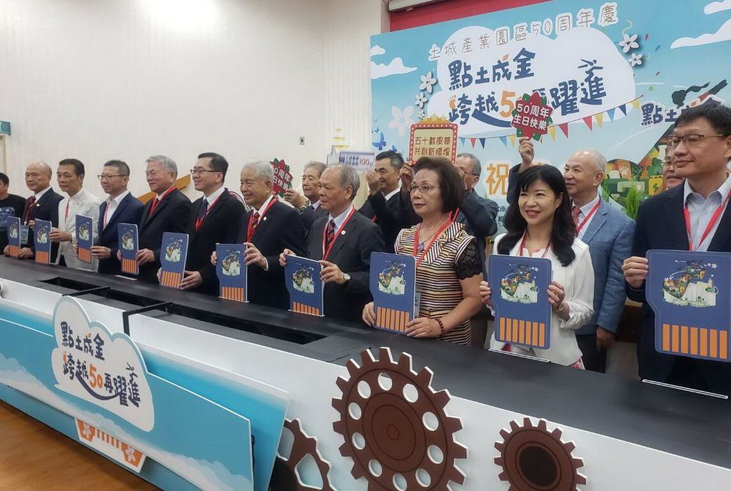 土城產業園區今天慶祝成立50週年,17家逾50年廠商代表合切三層蛋糕,伍智金屬等不同產業的第一代創辦人,共同倒香檳塔。家登精密等廠商澆灌樹苗,象徵呵護園區未來希望;來賓一同轉動象徵「工業精神」的齒輪。