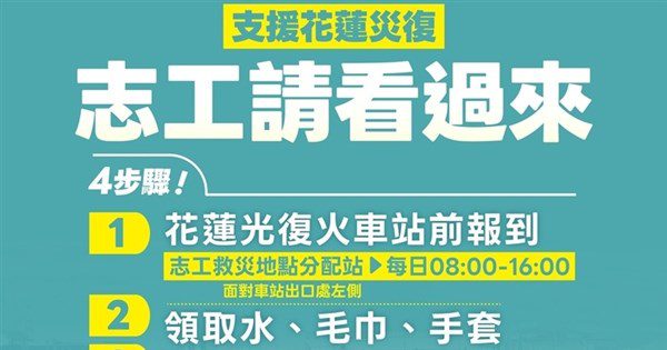 經濟部在臉書表示,根據行政院前進協調所資料,災後復原工作有4項重要資訊,首先,民眾若想前往光復鄉擔任志工,目前光復火車站前,中央前進協調所已經設立 「志工救災地點分配站」;民眾若非隨團體行動的志工,請先到分配站登記,現場會協調、安排最需要的災後復原工作;沒有工具也不用擔心,分配站備有器具可領取。