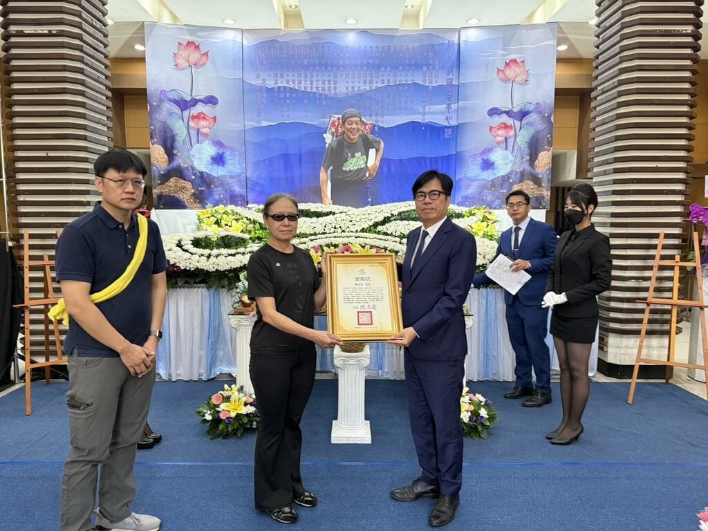 洪木生30多年前開始揹水上山奉茶,使山友往來得以解渴歇息,日前辭世,享壽70歲,今天舉行告別式,許多山友到場送他最後一程,陳其邁也出席並頒發褒揚狀,表彰其崇高義行。