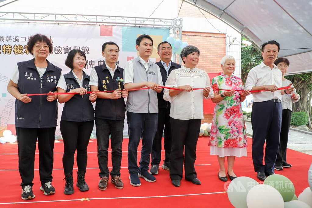 嘉義縣溪口鄉美林國小轉型成公辦公營「美林蒙特梭利實驗教育學校」,12日舉行揭牌典禮,縣長翁章梁(前右1)與民進黨立委陳冠廷(左4)及地方民代齊聚見證。中央社記者蔡智明攝 114年10月12日
