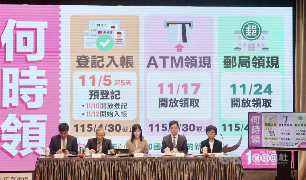 5個普發現金發放管道部分,登記入帳、直接入帳以及造冊發放入帳日最早,都是11月12日入帳,另外ATM領現11月17日開放、郵局臨櫃領現則在11月24日起跑。