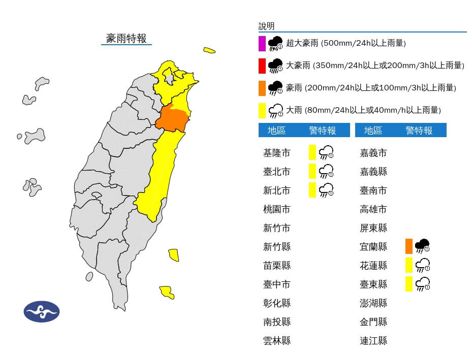 (中央社台北10日電)中央氣象署發布豪雨特報,颱風外圍環流及東北季風影響,今天宜蘭縣山區有局部大雨或豪雨,基隆北海岸、新北(汐止區)、宜蘭地區、大台北山區及蘭嶼、綠島有局部大雨發生的機率。