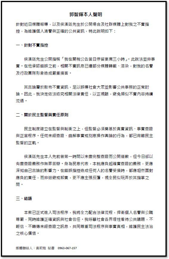 針對侯漢廷「先道歉、後不認罪」的法庭策略,郭智輝在聲明中嚴正駁斥。郭智輝指出,侯漢廷身為民意代表,掌握話語權,本應負起比一般人更嚴謹的查證義務。先前既已承認未盡完整查證而道歉,如今在司法程序中卻又主張「有盡義務」,這種說法反覆的行為,不僅邏輯自相矛盾,更是對司法資源的浪費。