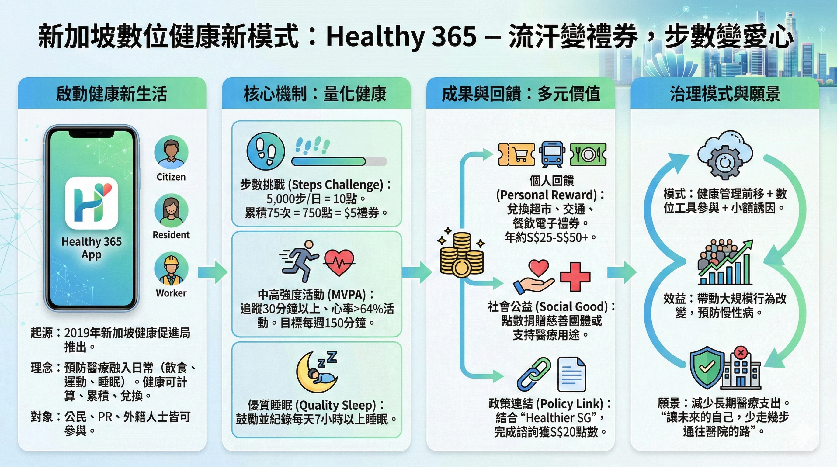 Healthy 365 亦是「更健康的新加坡」(Healthier SG)政策的重要工具。完成首次健康規劃諮詢者,可獲得等值 S$ 20 的健康點數。透過這種整合設計,預防醫療、社區診所與數位科技形成連動,使健康管理從政策理念落實於日常生活。