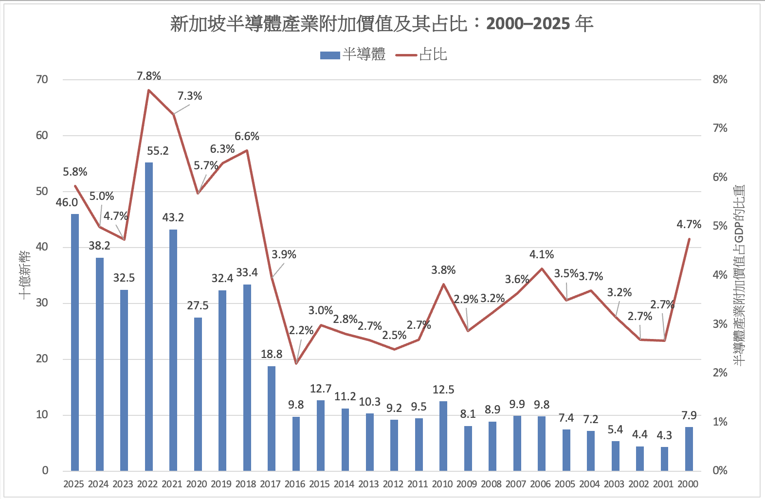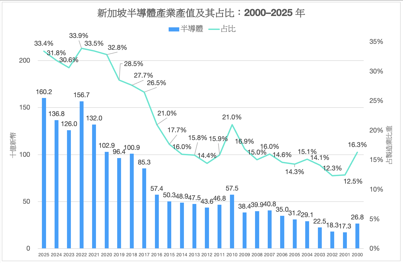 新加坡經濟發展局資料顯示,新加坡生產全球約 10% 的晶片,並製造約 20% 的半導體設備。2025 年半導體產業產值達 1,602 億新幣(約1,227 億美元),較 2024 年成長 17.1%。該產業占新加坡製造業產值比重達 33.4%,附加價值約 460 億新幣(約占 GDP 的 5.8%),並僱用逾 3.4 萬名高技術從業人員。2019 至 2025 年間,產業複合年成長率(CAGR)達 8.8%,顯示出強勁且穩定的成長動能。