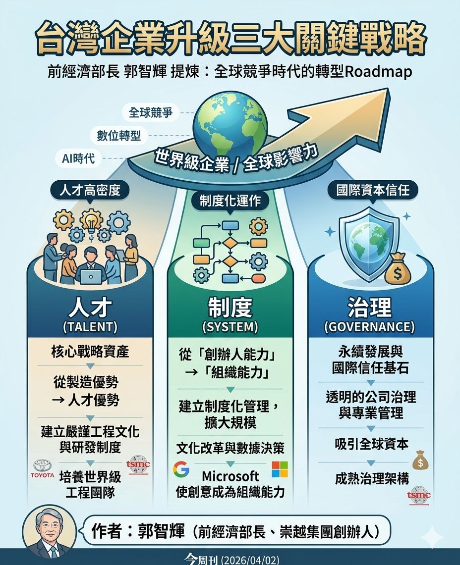 全球競爭加劇下,企業唯有強化人才、制度與治理三力,才能從區域走向世界。台灣正處轉型關鍵時刻,打造長期競爭力已成企業邁向國際的必修課。